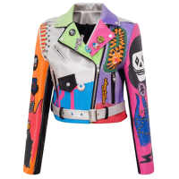 OEM Women Badge Rivet Graffiti PU Motorcycle Leather Biker Jacket For Ladies